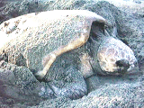 相良海岸には、年間30頭から40頭のアカウミガメが産卵の為、上陸してきます。 毎年5月から8月下旬にかけて、夜間の満潮前後にかけて、上陸し、1頭につき100個から150個の卵を 1シーズン2回から3回程度生みおとしてゆきます。 アカエミガメは、上陸前1時間程前から、沖合50メートル程のところで、海岸の様子を見て安全を確認して から、上陸産卵をします。 産卵穴は、後ろのヒレ2枚を上手に使い、深さ50センチ程の穴を、きんちゃく状に堀り、産卵穴を分からない ように上手に隠して降海してゆきます。 産卵中は、体内の塩分調整の為、目から大量の塩水を流す為、泣いているように見えるのが特徴です。 体長2メートル以上で体重100キロを越す、カメが上陸している姿は実に美しく、また雄大なものです。